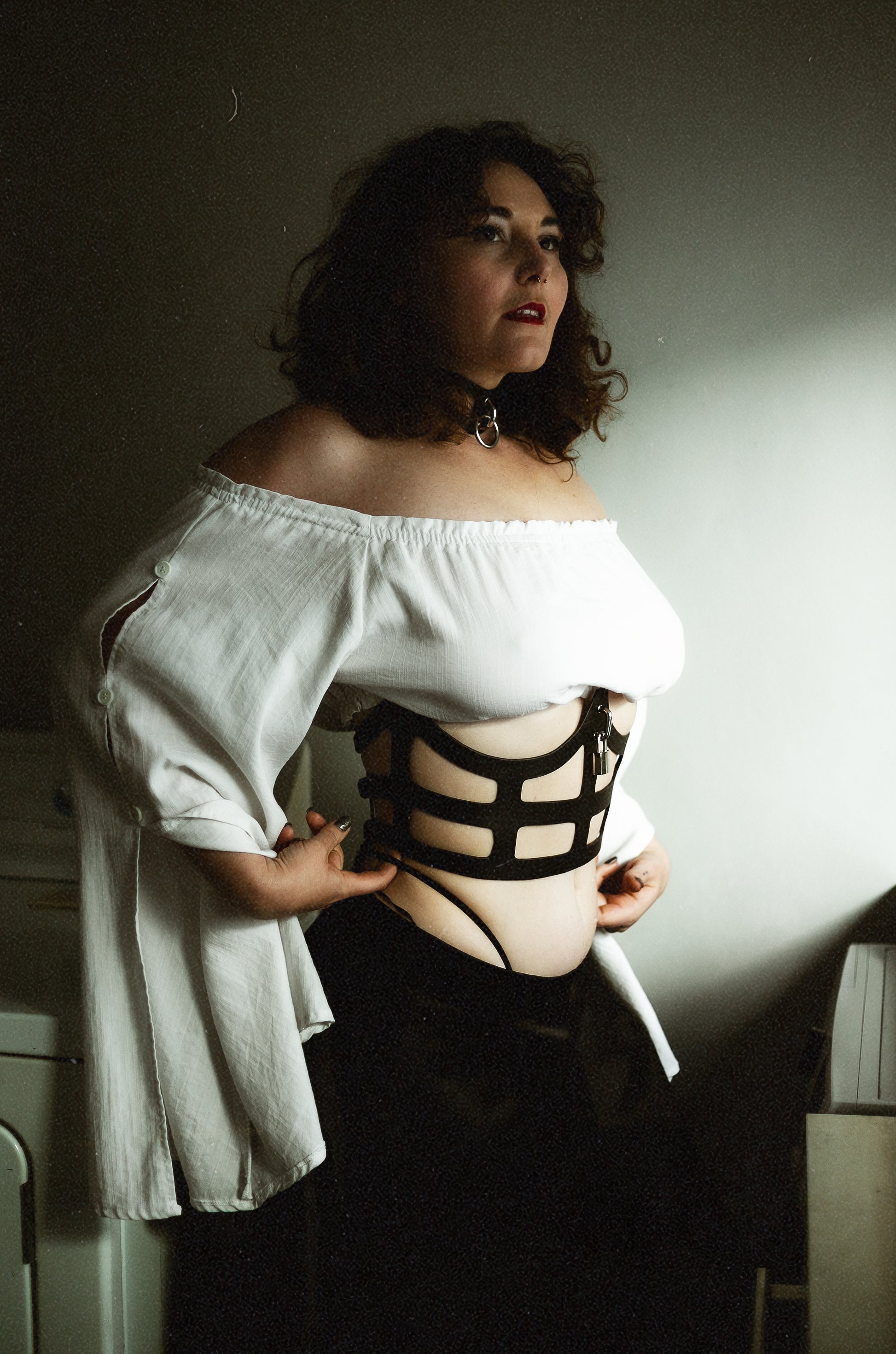 This hand-crafted corset redefines classic restraint with a contemporary edge. Its sculptural silhouette conforms to the body with precision, enhanced by adjustable buckles at the back for a tailored fit. A central, functional padlock adds an unapologetic element of symbolic control.